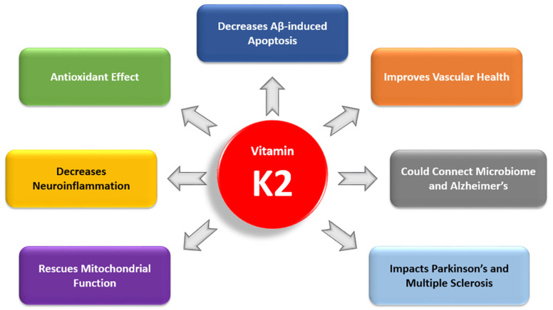 Auch K2 – in Verbindung mit D3 – hat eine Reihe von nachgewiesenen Funktionen und wird von uns dringend benötigt. Neben dem Nutzen für die Adern und für die Stabilität unserer Knochen ist es enorm wichtig für unsere Mitochondrien – die Kraftwerke in unseren Körperzellen – sowie für den Schutz und die gute Funktion unserer Nerven, wie die Grafik unten im Überblick zeigt (Zitat auf „Vitamin K2 holds promise…“)
